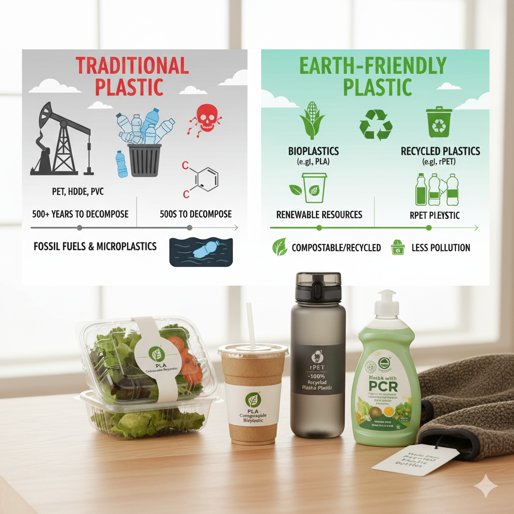 Traditional plastics (like PET, PVC, and HDPE) are derived from petroleum, a finite resource. Their persistence in the environment is the core issue.